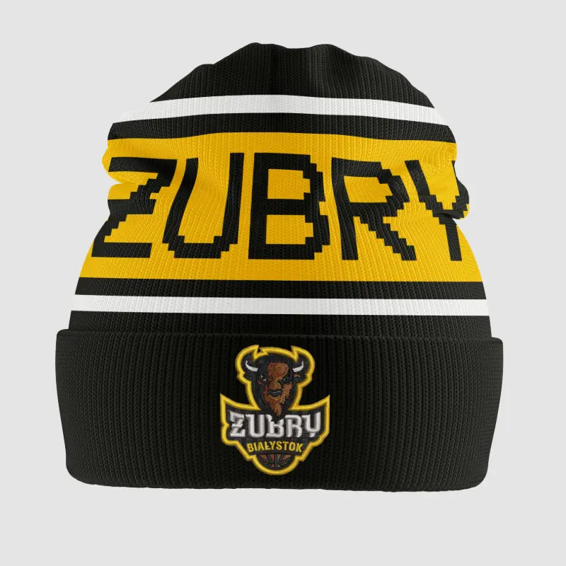 Oficjalna czapka zimowa Żubry Białystok – ciepły beanie w czarnym kolorze z żółtym nadrukiem „ŻUBRY” i logo! Idealna na mrozy i mecze. Kolekcjonerski must-have dla kibiców! Skład: